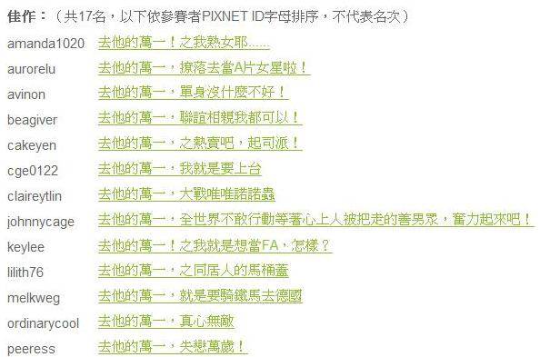 參加語文競賽,是我長久的願望。但不知為什麼,從小學到高中,校內的各項語文競賽始終沒有我參加的份(老師,我成績明明不差!)。因此,這次跌的那麼慘,真的很讓我沮喪。但若有同學問起比賽結果,還能發揮自我揶揄的本領,嘻皮笑臉地跟他們哈拉:就忘詞啦!